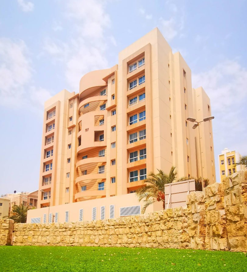 Post-tensioned concrete slabs 230 mm thickness for ten-storey (parking and 9 apartment floors) building in the Kingdom of Bahrain have been designed by STS. Bonded PT system consists of 4 strands 1860 MPa strength 15.7 mm diameter in flat tendons. The use of post-tensioning has reduced the consumption of concrete and reinforcement in comparison with conventional slabs.